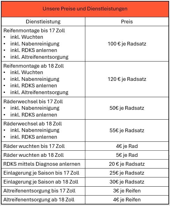 Von der Beratung, Reifenbestellung, Montage auf Felgen und Wuchten der Reifen, finden Sie alles bei uns unter einem Dach.